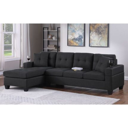 JORDAN Καναπές Σαλονιού Γωνία Αναστρέψιμος, Ύφασμα Μαύρο, Μπράτσα με ποτηροθήκες