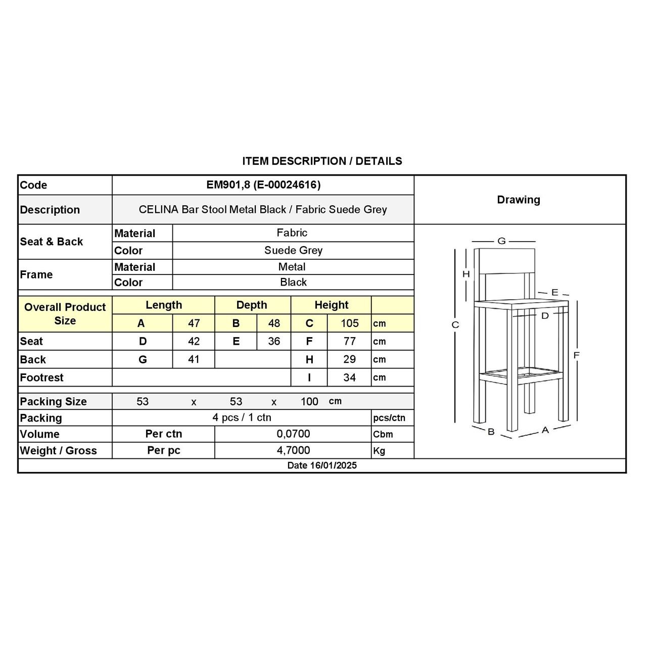 ΕΜ901,8 CELINA Σκαμπό Bar Μεταλ.Μαύρο, Ύφ.Suede Ανθρακί