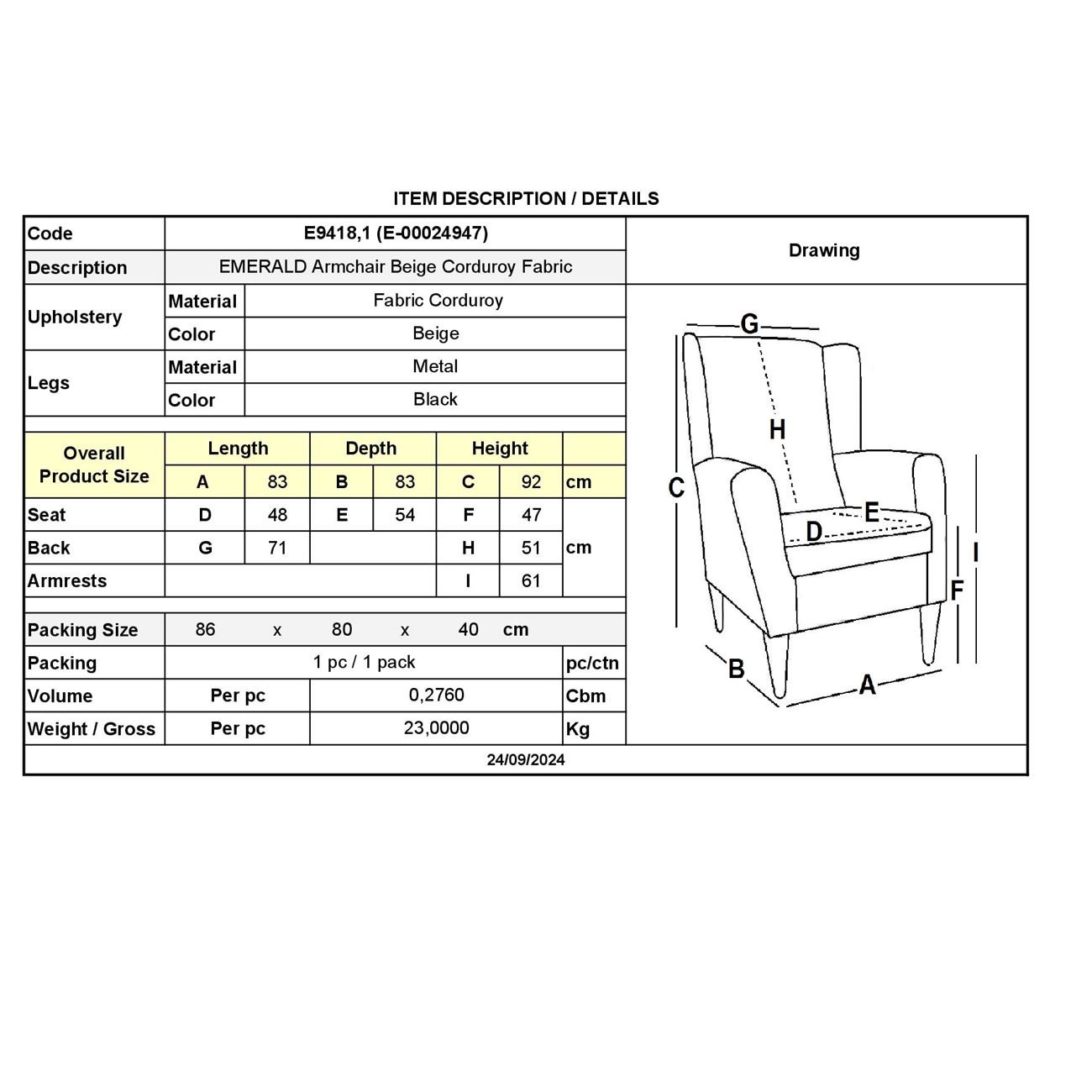 EMERALD Πολυθρόνα Σαλονιού – Καθιστικού, Ύφασμα Κοτλέ Μπεζ