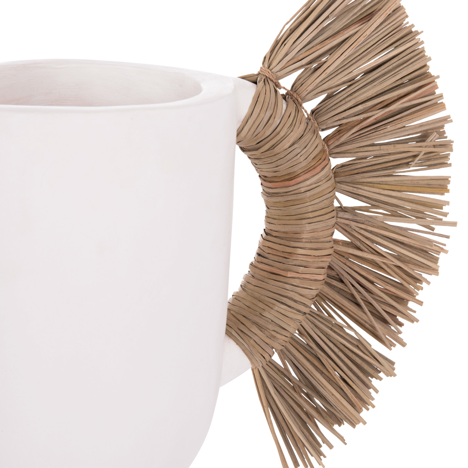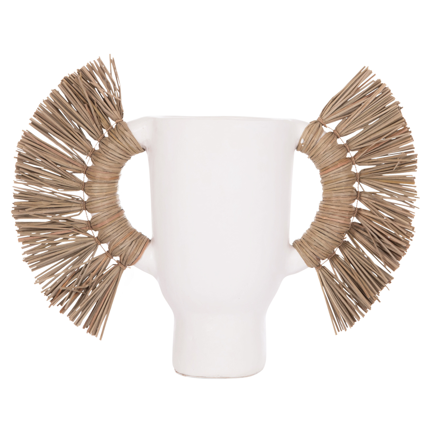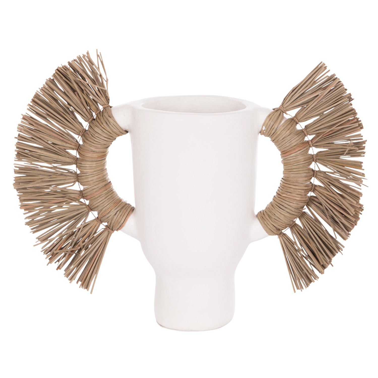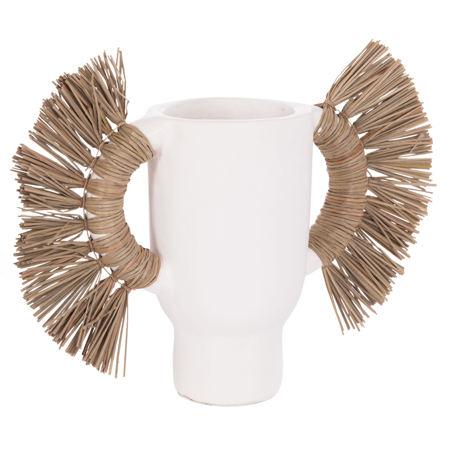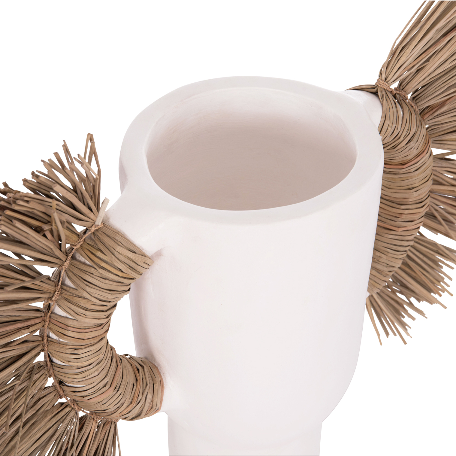 Το επιτραπέζιο χειροποίητο διακοσμητικό βάζο ALICA είναι ένα πολύ ιδιαίτερο διακοσμητικό στοιχείο για κάθε χώρο. Είναι κατασκευασμένο εξολοκλήρου από τερακότα σε ΛΕΥΚΟ χρώμα, ενώ διαθέτει και δύο χερούλια επενδυμένα με αποξηραμένο grass, και ένα σχετικά φαρδύ στόμιο.