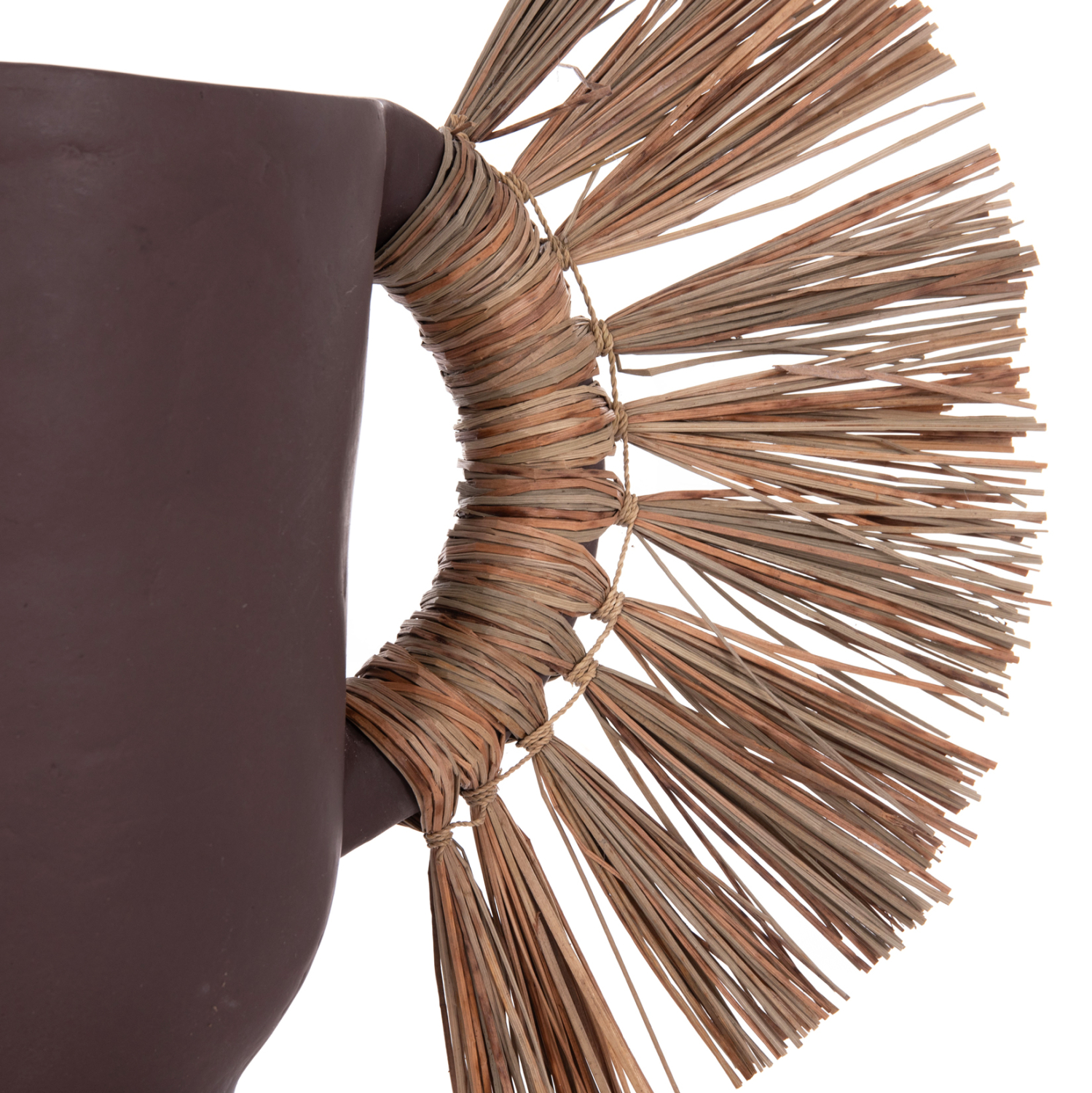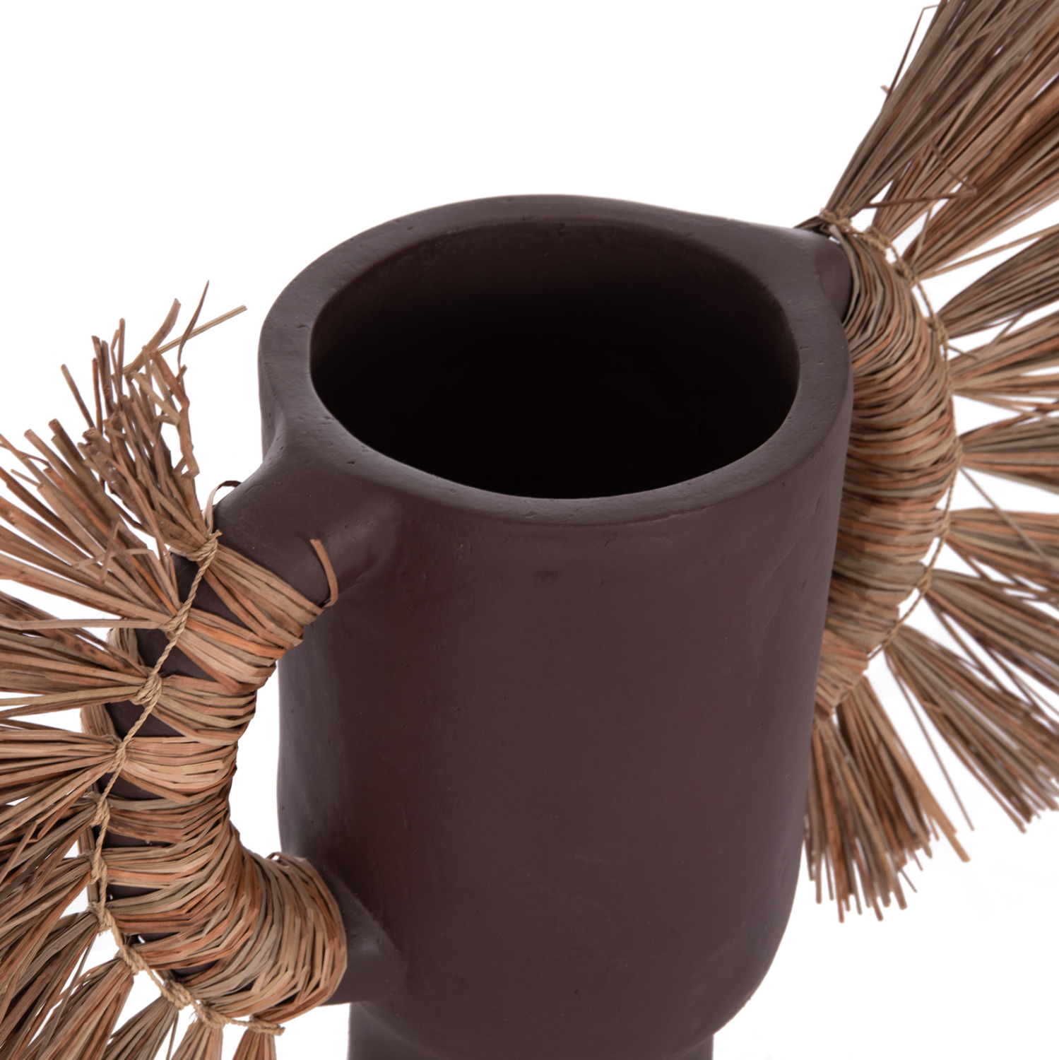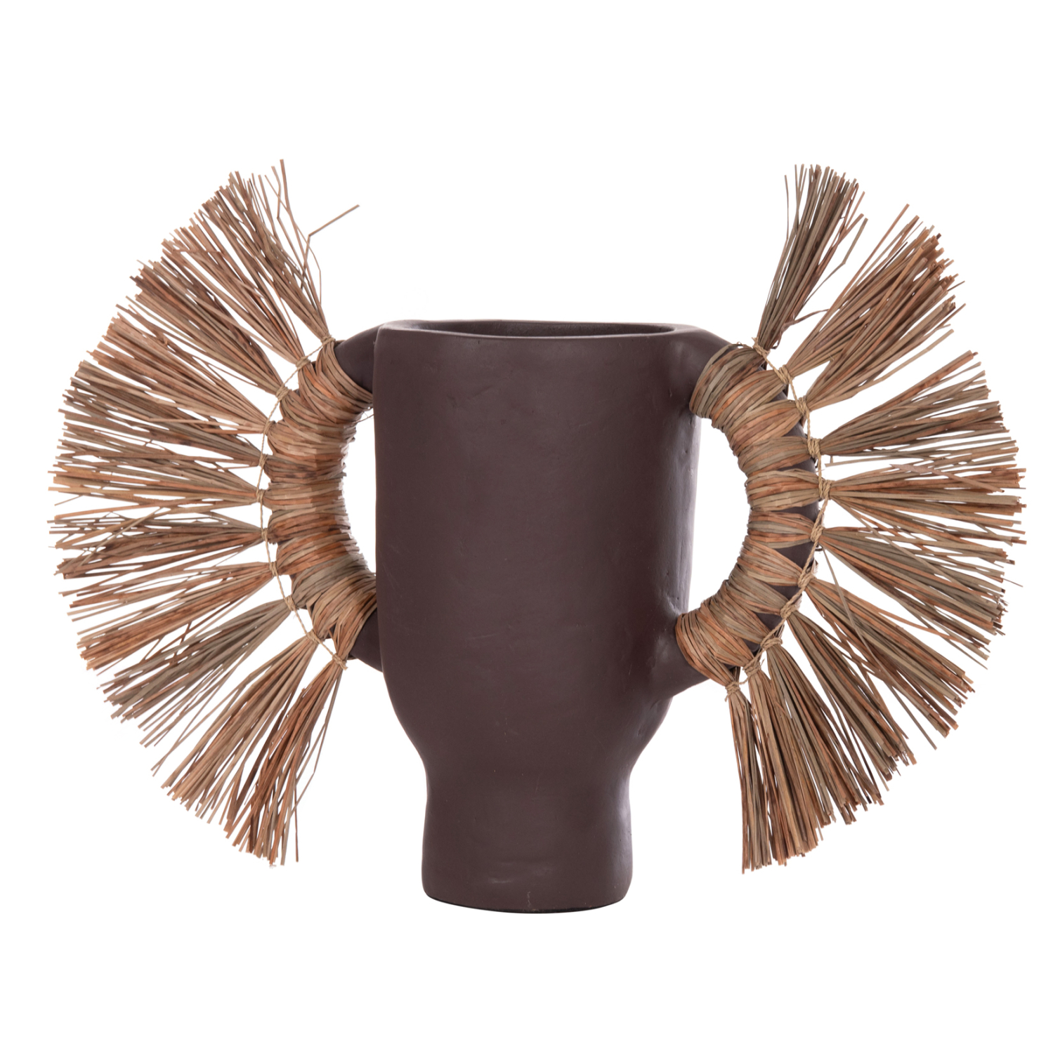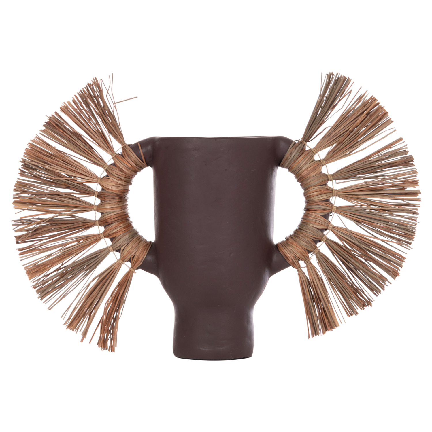 Το επιτραπέζιο χειροποίητο διακοσμητικό βάζο ALICA είναι ένα πολύ ιδιαίτερο διακοσμητικό στοιχείο για κάθε χώρο. Είναι κατασκευασμένο εξολοκλήρου από τερακότα σε ΣΟΚΟΛΑΤΙ χρώμα, ενώ διαθέτει και δύο χερούλια επενδυμένα με αποξηραμένο grass, και ένα σχετικά φαρδύ στόμιο.
