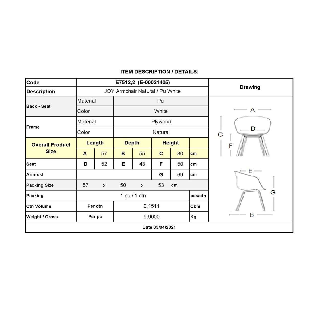 JOY-W Πολυθρόνα Τραπεζαρίας Φυσικό, Pu Άσπρο